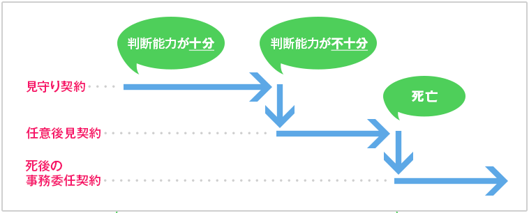 そのようなご不安を取り除くためには、「見守り契約」がおすすめです。「見守り契約」は、任意後見契約を結んだ後、元気なうちから月1~2度ほど連絡を取り合い、場合によってはご自宅まで訪問して、本人の状態を逐一チェックしていく契約です。会話の中で、判断能力の低下がみられたときには、速やかに家庭裁判所への申し立てを行うので、認知症になってから家庭裁判所に申し立てをするまでの最も危険な期間を最小限に抑えることができます。